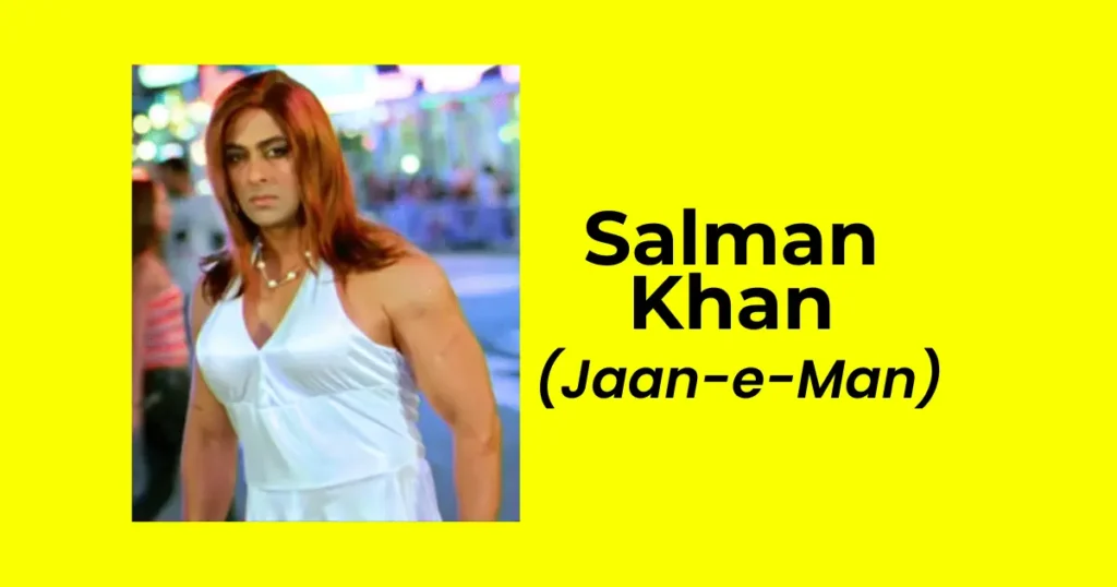 यूं तो सलमान खान भाईजान के नाम से बहुत जाने जाते है। लेकिन जान-ए-मन फिल्म में एक फनी सीन के लिए सलमान ने भी औरत का गेटअप धर लिया था। भले ही ये सीन छोटा सा था, लेकिन काफी इंटरटेनिन्ग था। बॉडीबिल्डर सलमान खान को साड़ी और नकली बालों में देखकर दर्शकों के हँसते हँसते पेट दुखने लगा था।